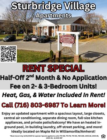 Sturbridge Village Apartments on Maple Road near North Forest Rd offers pristine units with plenty of amenities. In addition, we have the best location! There are many restaurants like Ranchos Tacos, 800 Maple, Fuji Grill, Dandelions Restaurants, right down the street. The Ellicott Creek Trailway Park and Audubon Golf Course are only a couple of minutes away. Moreover, there are many stores, schools, entertainment options, and public transportation in the area!