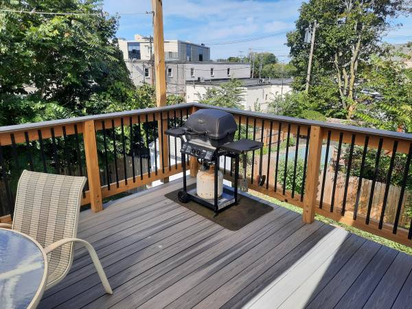 Beautiful outdoor deck with grill and table if desired, overhead fabric cover for shade