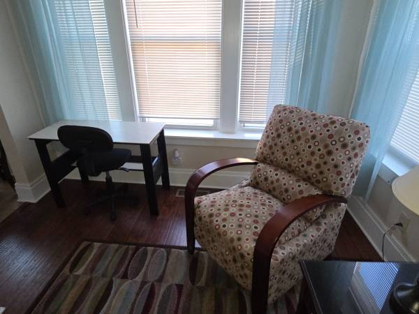 A newly renovated, furnished one bedroom second floor apartment. Many extras including mounted flat screen TV, stainless steel appliances, quality laminated floors, porcelain tiled kitchen, bathroom, laundry room, newer appliances including washer and dryer. No smoking, no pets. Must be clean and reasonably quiet.