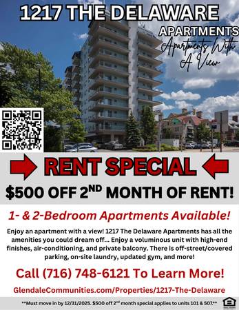 1217 The Delaware is a stunning, hard-to-miss high-rise on Delaware Ave in downtown Buffalo. Walkable to the Elmwood Village and close to the Buffalo Niagara Medical Campus, these 1 and 2 bedroom apartments are perfect for anyone looking for luxury in a booming location. High end finishes and panoramic views of the city on the outdoor balconies make this property one of the most unique in the city. Off-street parking and an intercom/key fob system for building entry ensure the safety of our residents at 1217 The Delaware.
