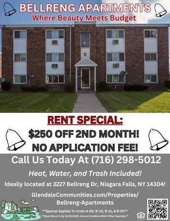 Enjoy $250 off your 2nd month of rent when you move into Bellreng Apartments by 11/30/2025! Also, we are currently waiving the application fee for Bellreng through 11/30/2025. Special applies to units A5, B10, B11, & B20. Special ends 11/30/2025.