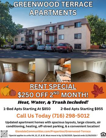 Enjoy $250 off your 2nd month of rent when you move into Greenwood Terrace Apartments by 11/30/2025! Also, we are currently waiving the application fee for Greenwood Terrace through 11/30/2025. Special applies to units 4,12,17, & 32. Special ends 11/30/2025.