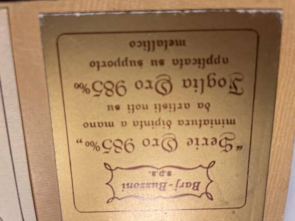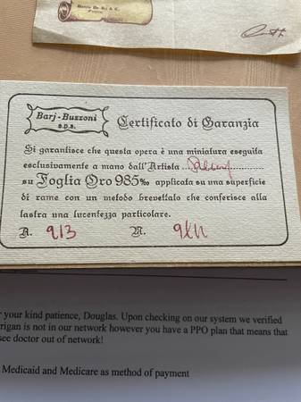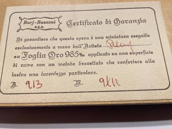 Barj-Buzzoni miniatures on copper with 985% Gold Leaf are considered valuable pieces of art due to their unique materials and intricate craftsmanship. Based on current online sales of similar (though not identical) Barj-Buzzoni pieces, you could generally expect a value in the hundreds of dollars, potentially reaching over a thousand for exceptional examples.