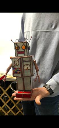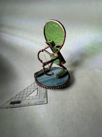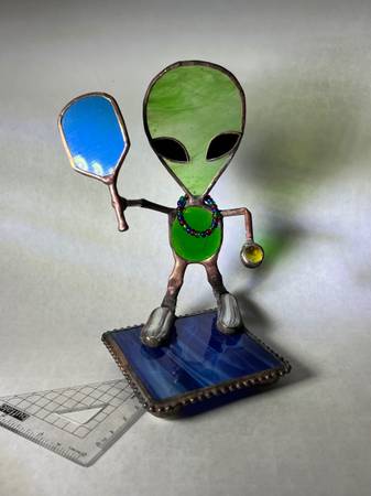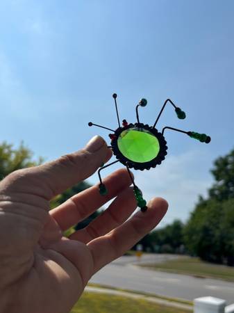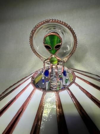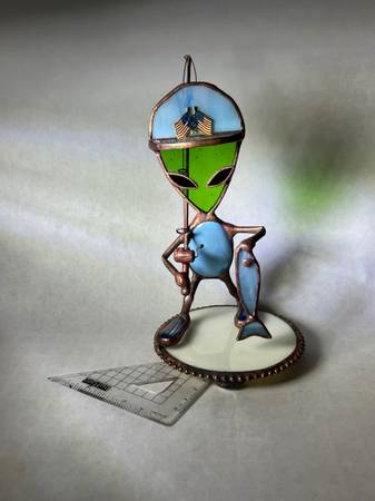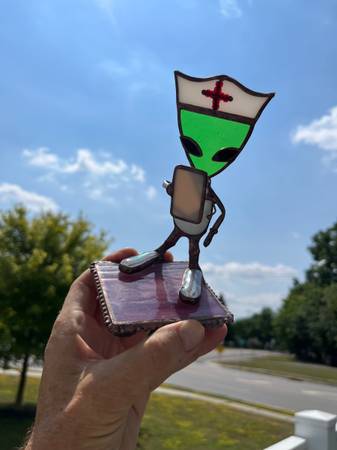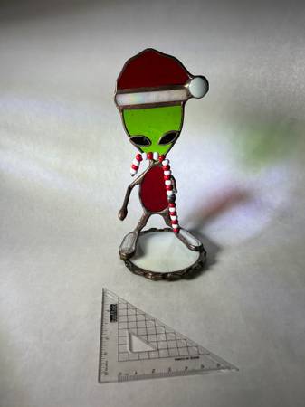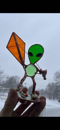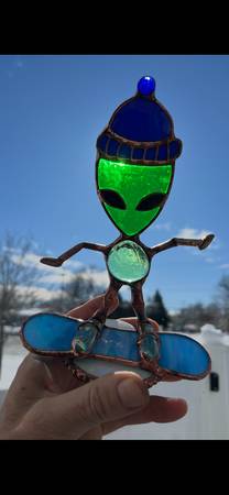 I create custom stained glass. I’m currently taking a limited number of orders for Christmas.My work can be seen at AEROGLASSART on Etsy…I currently have a variety of Aliens doing various things…or can custom make one for you.My work can be seen in my work shop in Williamsville near Maple And Transit. Prices vary but average $40-50. Space Bugs are $20 each with beveled mirror base.Pick up locally or shipping is available.