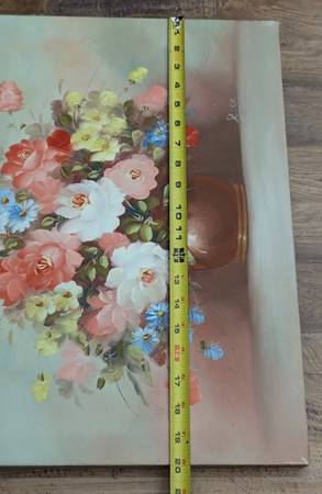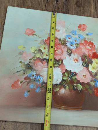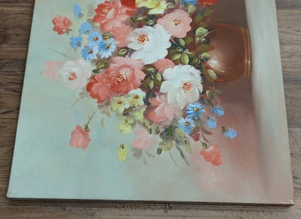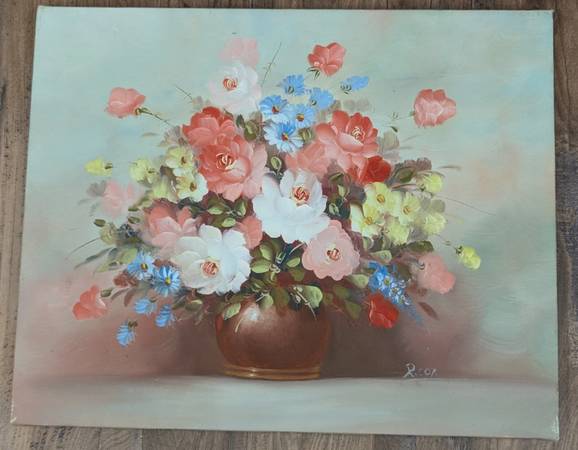 Up for sale is an oil painting on canvas - signed "R Cox." It features a still life of flowers in a pot. Painting has a few light marks and wear. See photos for measurements. Pickup will be in West...