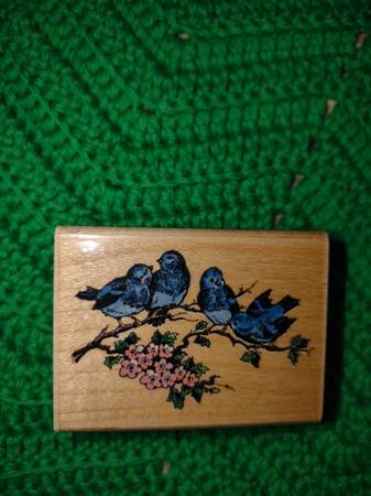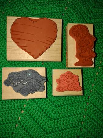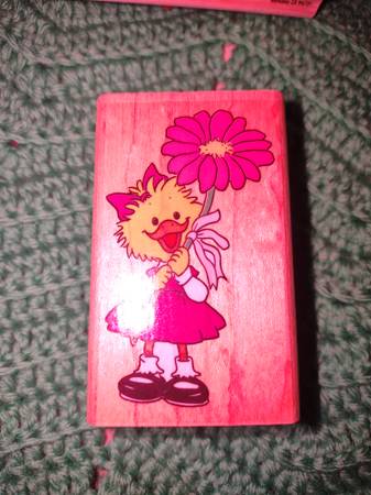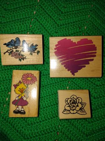 Five beautiful quality wooden handled rubber stamps for card making and crafting. Includes large free form ❤️ heart, adorable chick offering a just picked daisy, glorious open 🌹 rose, a blossoming branch with four birds and a long steamed pansy.