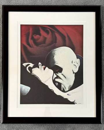 Large signed print titled "Nosferatu" by Keller. Produced on archival paper and hand signed by the artist. Professionally framed with white matte with deep mahogany wood frame. Protected by museum...
