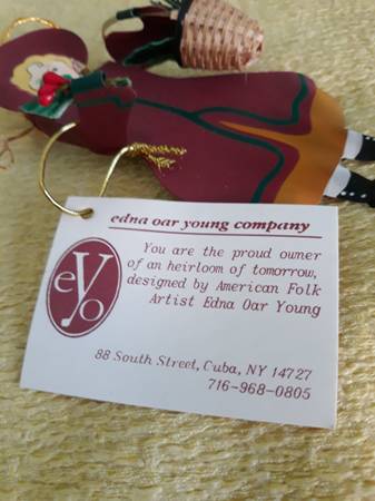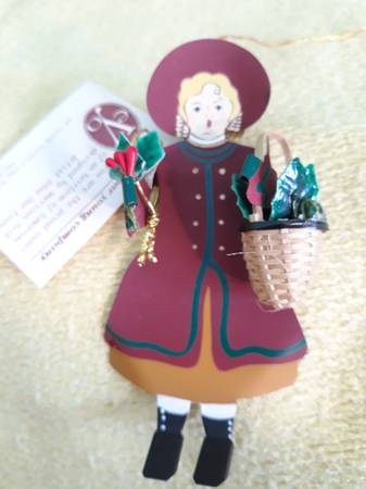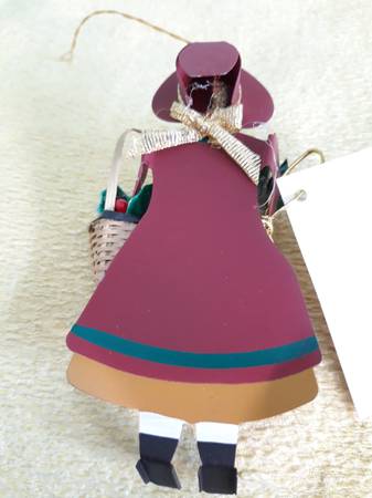 This is a vintage metal hand painted Christmas caroler ornament. It is 4" tall. The company card is attached. And the card where purchased is also in the box.