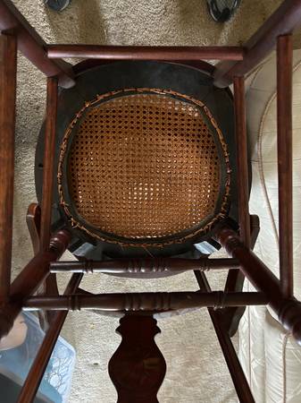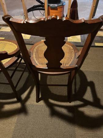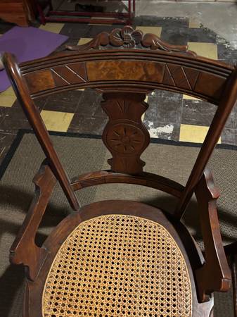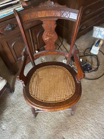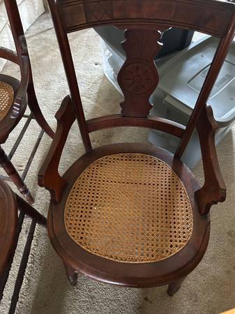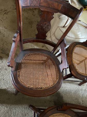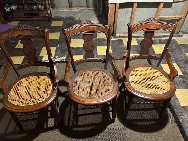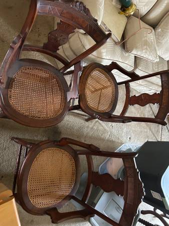 Qty 3 antique chairs with cane seats. One of the chairs will need repairs on one of its arms. Chairs are in good shape. Price listed is for all 3.