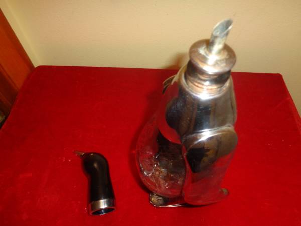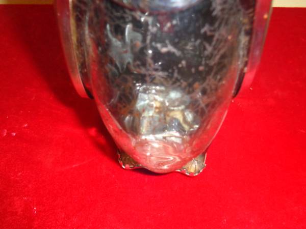 This decanter was purchased by my father over 40 years ago at an estate sale>>it is a chrome gold veined glass decanter that has a music box as you pick it up > the playing is "iffy" sometimes plays -sometimes not> the original label of identifying the tune "How Dry I AM" is only partially there> the important part > that of the cork is still intact. The bottom lists as "Made in Japan"> it is a great looking piece for the shelf of a bar or on a liquor cart....and it it is still very usable.
