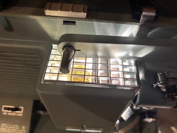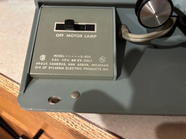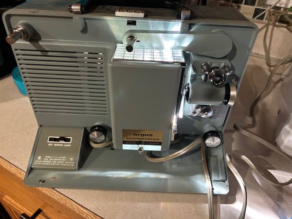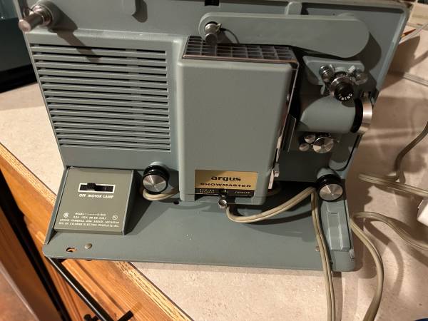 BAIA Mark II 8 mm Reviewer, Argus Showmaster model S-500, Tower Photographic Equipment no 9875. All turn on (see pictures) and are in good working order. I am not quite sure what all the knobs/buttons do, so I haven’t messed around with the equipment too much for fear I may break something.
