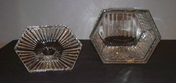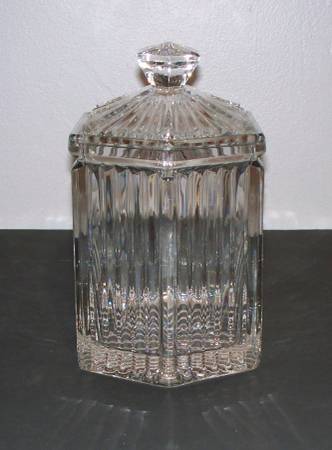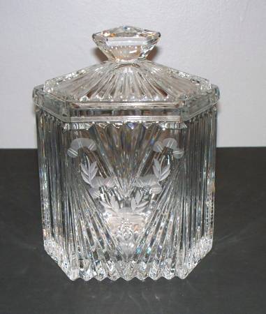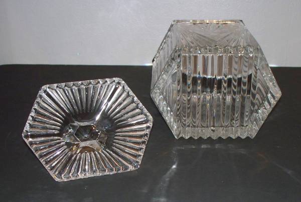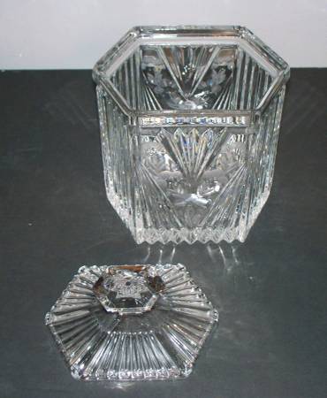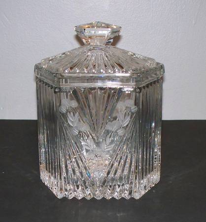 Rare 1960's Clear Crystal Biscuit Jar from the Czech Republic. Hexagon Shaped with Ribbed Vertical Pattern, and Wheel Cut Flower Design on Front and Back. In excellent condition no flaws, chips, or cracks. See pictures. Measures 8.5"H x 6.5" Side to Side x 5" Front to Back. Asking $50.00 If interested please call only no texts to show contact info