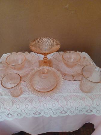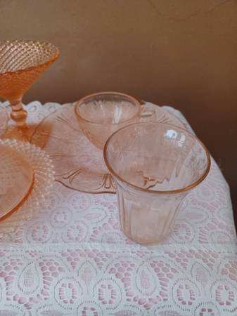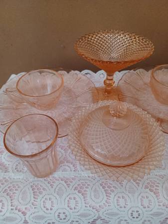 I am cleaning out my mother's house and these 9 Depression Glass pieces were in her Curio Cabinet > all pieces are perfect with no chips or cracks on any of the pieces> there are 2 sets of matching teacup and plates, 2 Juice glasses, one compote, one covered dish