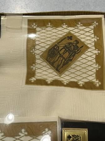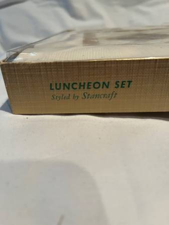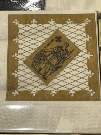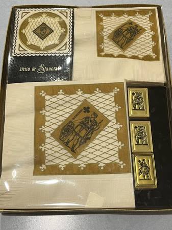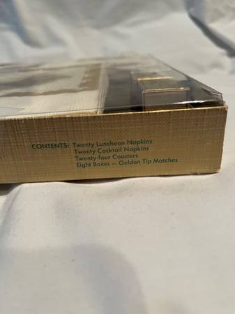 Vintage "Parmenion" Luncheon Set styled by "Stancraft" Set includes: 21 Luncheon Napkins 18 Cocktail Napkins 19 Paper Coasters 3 Boxes Golden Tip Matches Original Box Excellent condition! Pick up a...