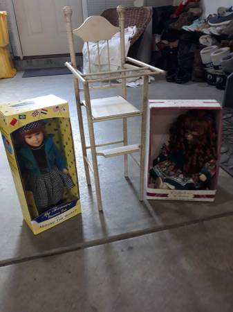 Collectable dolls and highchair, all for $50,call or text 238-two zero three five