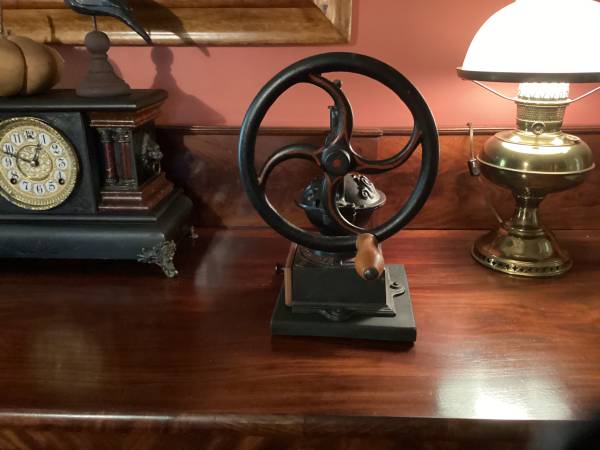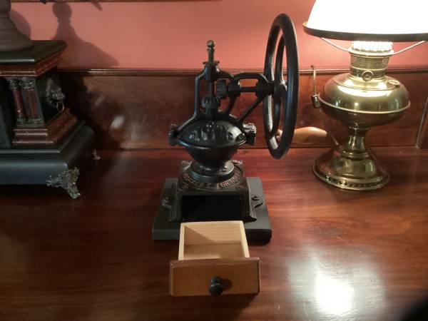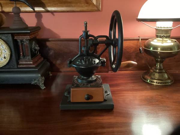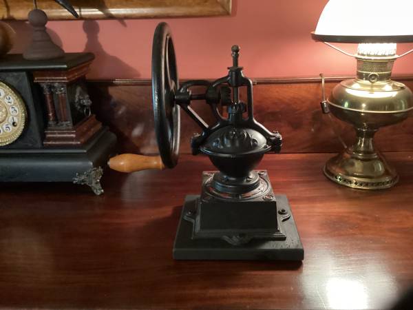 Vintage Coffee Grinder Functional, can be mounted on countertop Excellent condition 14” H @ top of wheel Wood Base is 8” x 7 1/4” Excellent condition $85 No texts please, phone number is a landline