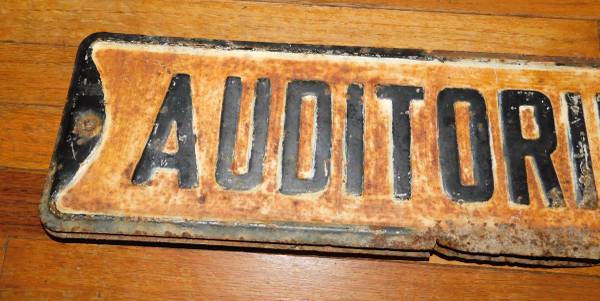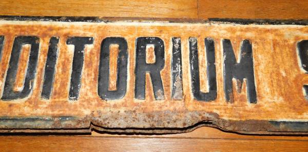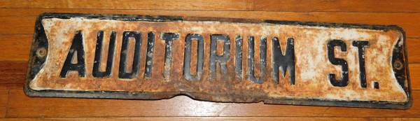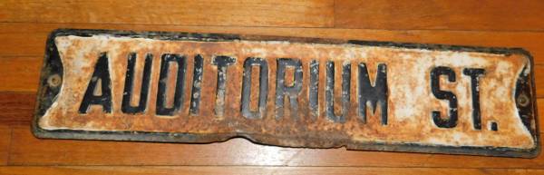 Vintage Metal "Auditorium St." Street Sign 2 Metal Street Signs, Bolted Together Measures Just 28" by about 6" They do Show Surface Rust, Wear/Marks, Dings, Dents from Use Age of the Street Signs is...