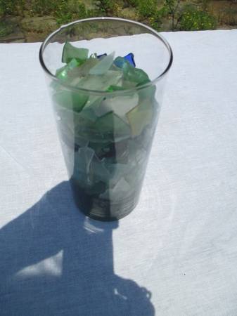 For sale is a 3.5"x8" clear glass vase filled with various colored beach glass. There's pale green, bottle green and brown, blue etc. $15 obo. Will ship at buyer's expense. If ad is up, it's...