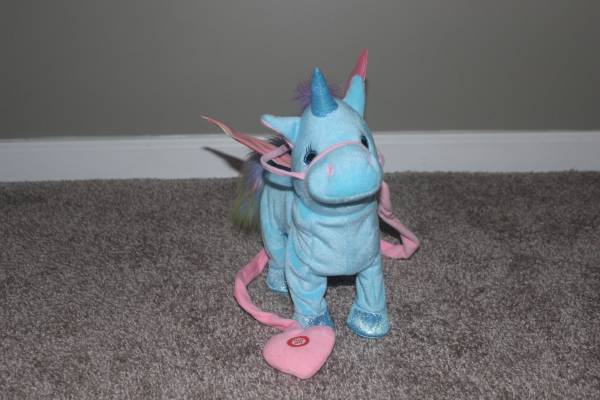 Elevate your child’s playtime with this Electronic Walking and Singing Unicorn Plush Toy. Hold the heart shaped handle, at the end of its leash, and push the power button that's located there. Pressing the button will prompt the unicorn to walk, move its head, wag its tail and sing. It sings two songs that are sure to thrill and delight your child. It is brand new and has never been used. Please call or text show contact info