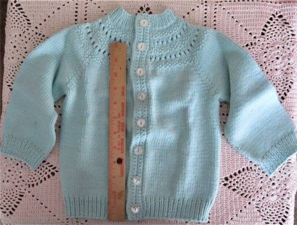 Vintage Handmade Knit Baby Sweater, Aqua button-down Cardigan, Excellent Condition.
