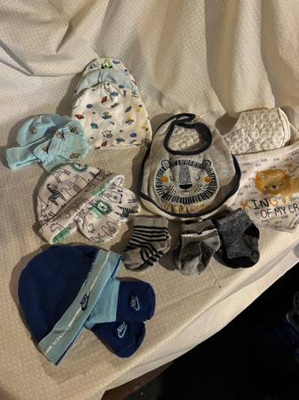 26 Pieces Baby / Infant Boy Clothing Size 0-6 Month Includes: 3 - Cap & mitten sets 3 - Caps 3 - Bibs 3 - SS Onesies 5 - LS Onesies 3 - Pants 3 - Pairs socks Brands include Nike, Carters, Polo,...