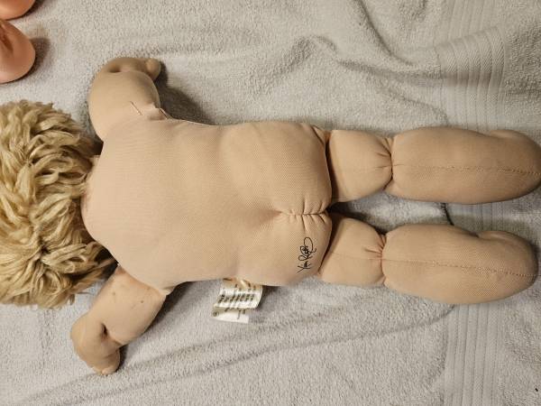 Vintage boy Cabbage Patch Doll. Blue eyes, freckles, blonde hair, and dimples Stains as seen on photo. No rips or tears Signed by Xavier Roberts.