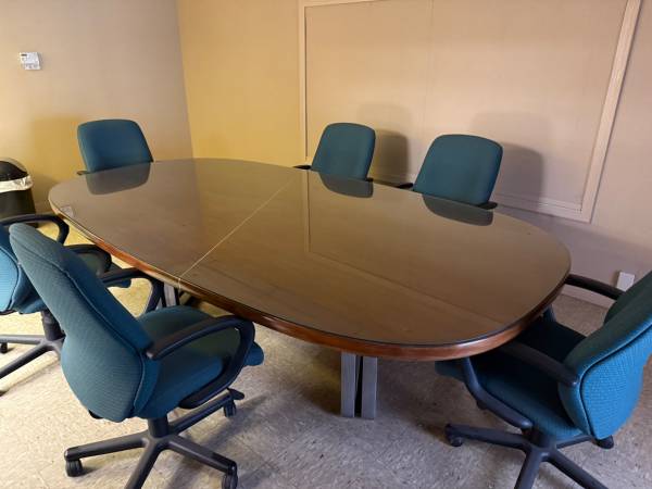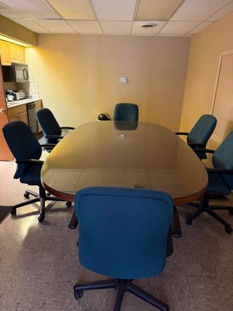 5’5 wide by 10ft. Long, 6 chairs,Glass top ,metal feet and wood top.You pick up!