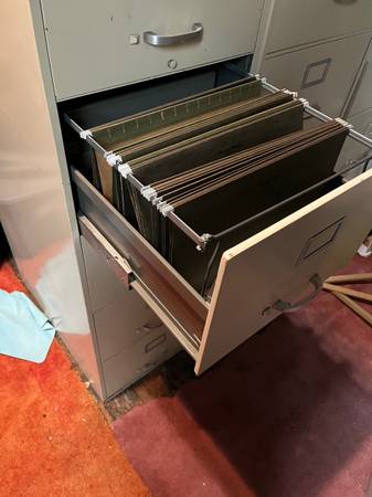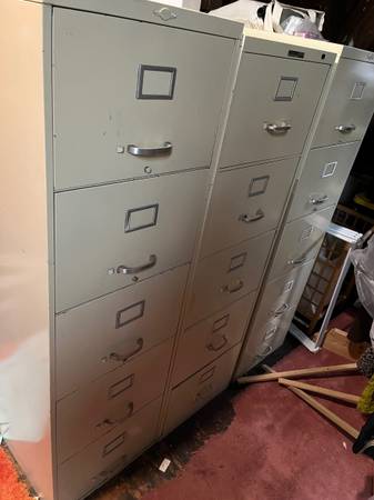 3 metal office filing cabinets. Some folders and folder racks included. 5 drawers high. $20.00 each or all three for $45.00
