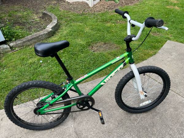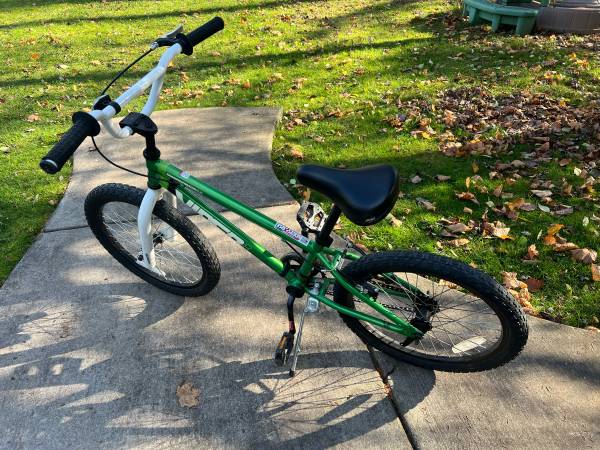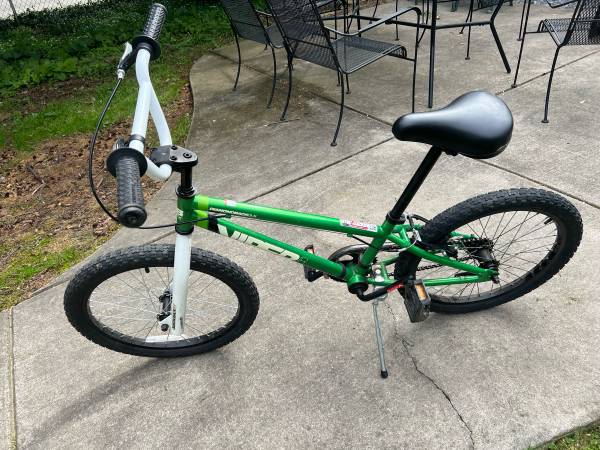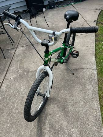 Green/ White 20” bike. Good tires, ok brakes. Rear tire needs new Axel/ axel repaired or new rim.