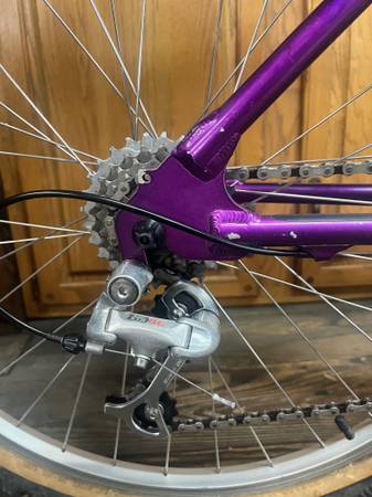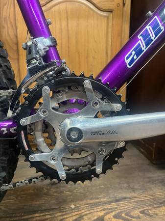 Here is a GT Backwoods Mountain bike in 18". This beautiful 7000 series Aluminum frame is in excellent overall condition. I try and find the bad scratches, and take pictures of them. There are a few scratches here and there, but otherwise the beautiful purple paint is very nice! (see pictures). No dents, no dings, and the frame is straight. This GT Backwoods mountain bike is in excellent overall condition with Shimano Deore LX crank, Shimano STX RC rear derailleurs, Alivio wheelset and Shimano trigger-type shifters. It has 21 gears (3 up front, and 7 in rear). The Manitou SX suspension fork soaks up trail chatter for a very comfortable ride. The upgraded Shimano V-brakes provide stopping power on this very capable, serious off roader. As a former bicycle mechanic, I just gave it a thorough tune up. Washed bike, removed, degreased, cleaned, reinstalled and lubed the drivetrain. I put the wheels in a truing stand, and they spin straight and round. I installed new brank cables, and housing, along with new shift cables and housing. Also installed new grips. Shifts, stops, and rides as it should. This tune up and labor would cost $150+ parts at any local bike shop, so please take that into consideration when purchasing.