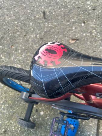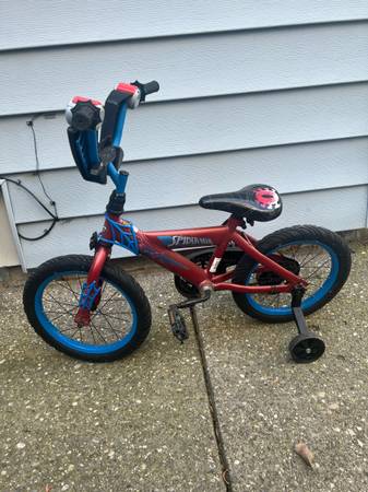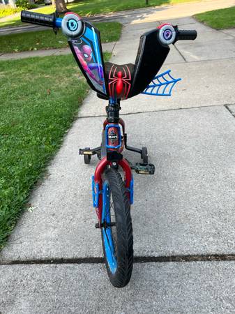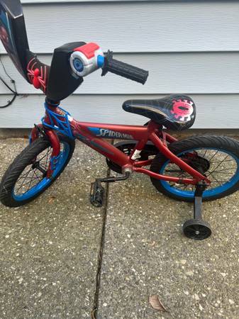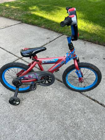 16 inch tire Spider-Man bike with training wheels. In good condition some things scratches but otherwise perfect riding condition.
