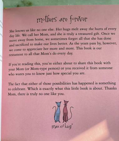 Cute little book, 5 1/4” square, 80 pages. A little book to remind your mother you’re always thinking about her and will always love her.