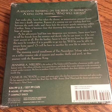 The Runaway King by Jennifer A. Nielsen (the sequel to The False Prince) read by Charlie McWade. 7 CDs. 8 Hours, 27 minutes. Brand new, never opened. Sold as is Text or call if interested. No...