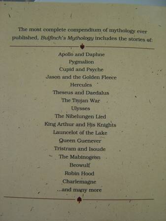 * Bulfinch's Mythology: The Age of Fable, The Age of Chivalry, and Legends of Charlemagne. Illustrations by Sabra Moore. large softcover, 732 pages. LIKE NEW.
