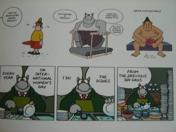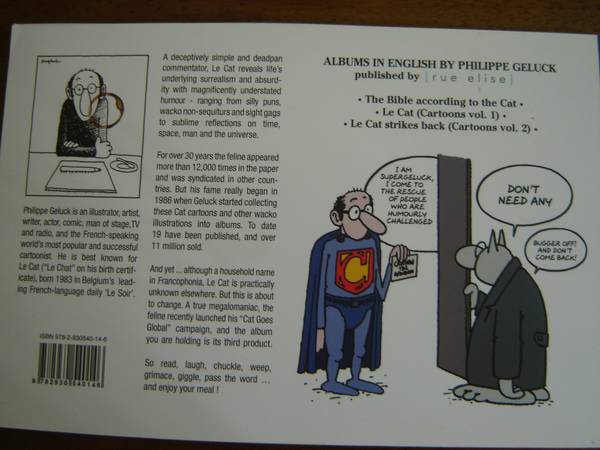 * *LE CAT Strikes Back by Philippe Geluck, translated from French. published by Rue Elise, Bruxelles, France. (2014). Colorist: Serge Dehaes. softcover, oblong 9.8 x 0.4 x 6.5 inches.. "the...