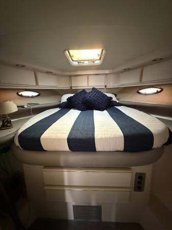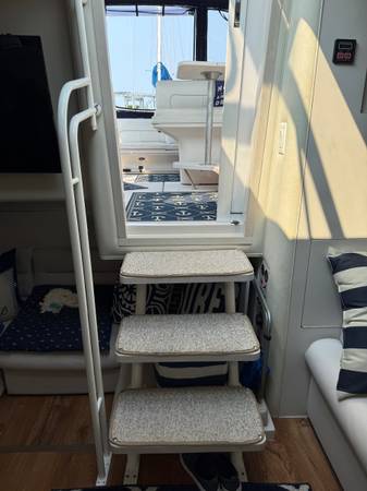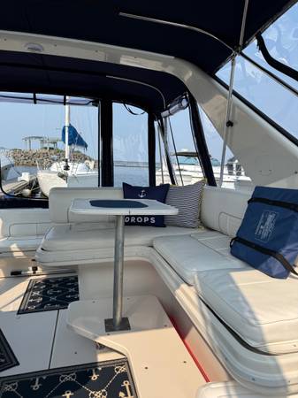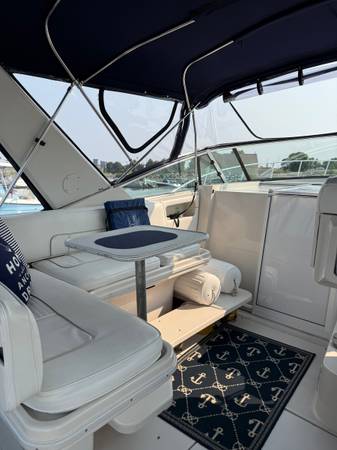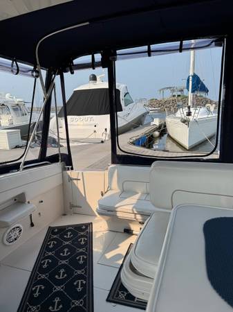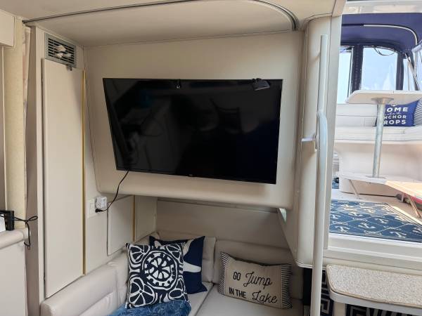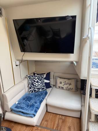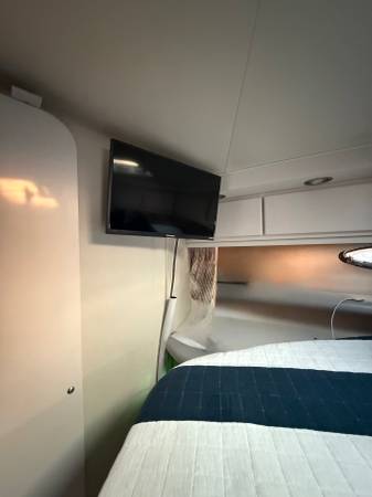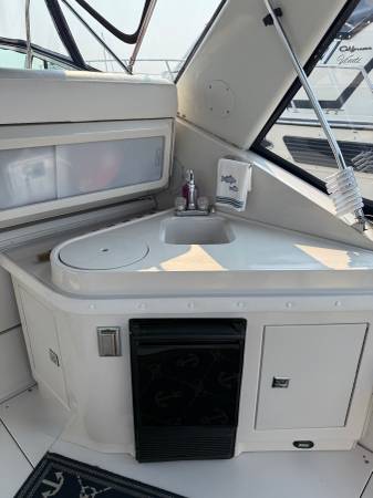On deck, you will find a full helm station, with an ice maker, a wash basin and lots of seating for entertaining. All new upholstery. Below deck, really shines with full optimization of the space in the design. With an open plan in mind, a full galley with many cupboards/ storage. The Head is very spacious and has a separate shower.