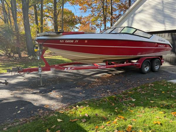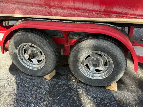 Eagle tandem axle boat trailer. Believe it to be around a 2002. Year is an approximate, there is no paperwork. Came with a 23 foot Stingray I bought to part out. Single axle of disc brakes that I believe to be working. Newer tires. Towed the boat home 40 miles and it towed very well. Will need new bunks.