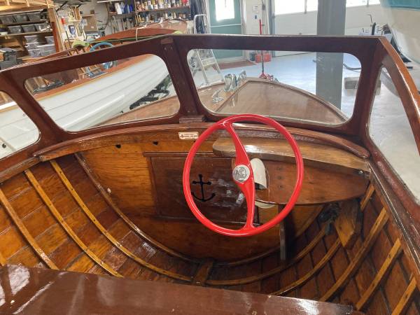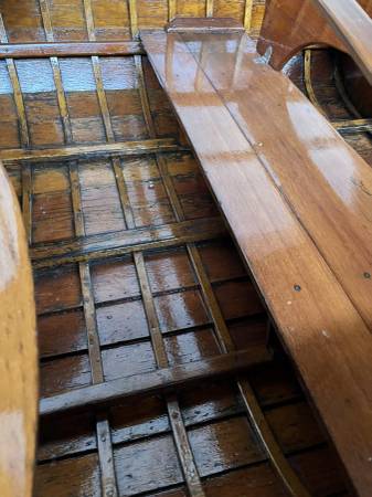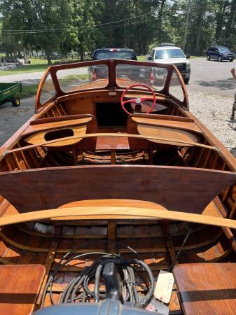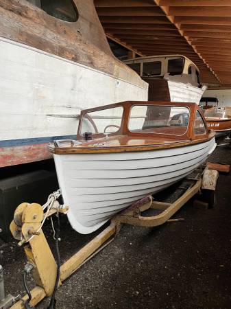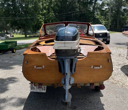Wood, lapstrake classic Lyman outboard with 35' hp Evinrude electric start outboard motor and Gator trailer. Good condition. Owner passed away.