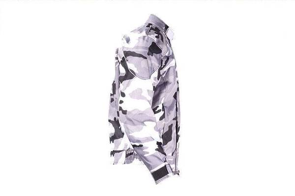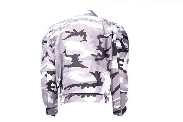 Great looking white camouflage men's mesh motorcycle jacket can be yours at a great low price! This jacket features a Z/O lining. protective pads on shoulders, arms, and back, multiple pockets, and zippered cuffs! $39.95