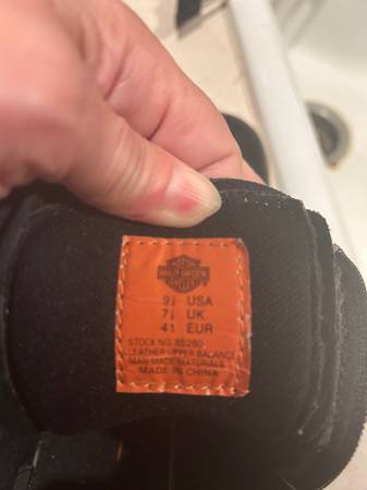 Side zipper with buckle across the front. Harley logo on side, bottom and in size tag.