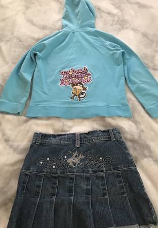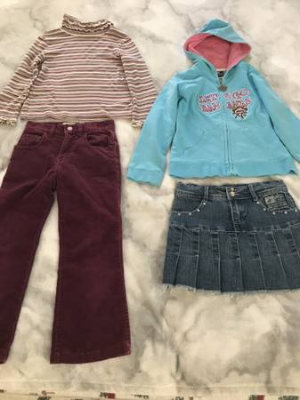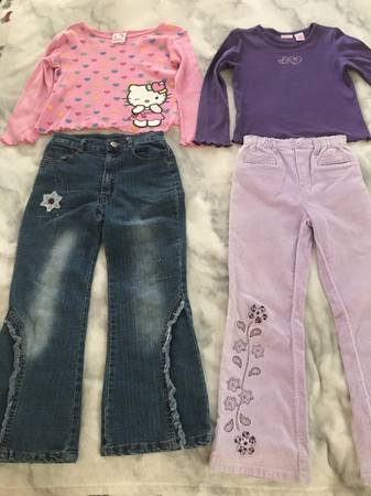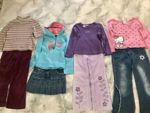 Burgundy pants with striped shirt from Gymboree, Blue and Pink Let's go bananas jacket and Polo Club skort, purple embroidered pants and purple shirt with hearts, Jeans with flower and other decorations and pink Hello Kitty shirt. Set of 8. All item size 6X. Items could be purchased separately.