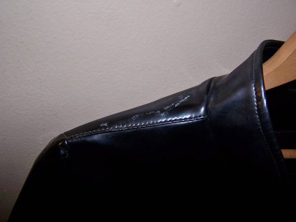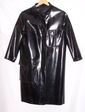 Vintage buttoned ladies shiny black vinyl coat. Travelcoats by Naman. Trench style or even goth or fetish style. Has two pockets in the front. In excellent condition except for some kind of stain on the right shoulder. Not sure how to get it out. Its 38" long from the middle of the shoulder to the bottom. Size is not marked but guessing a medium M to large L. Asking $40 or best offer. 44O-four52O