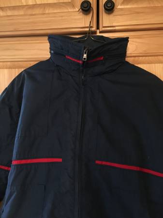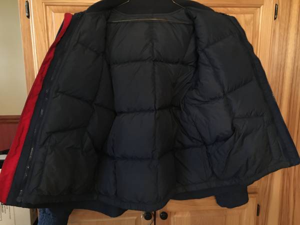 Zip out down lining. Good condition. Washable. Size M. The nylon hood (which was hidden in the zipper that goes around the neck) has been cut off because my son said it was annoying. 😁 You can’t tell it was ever there.