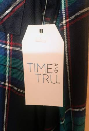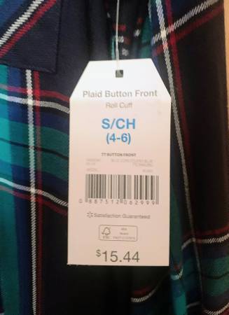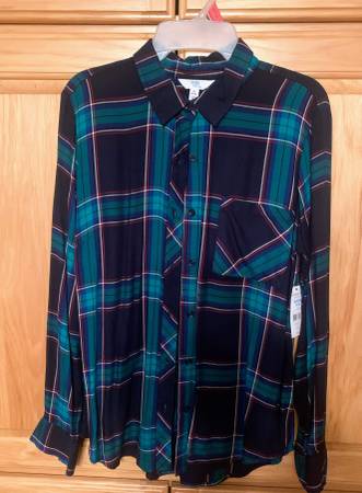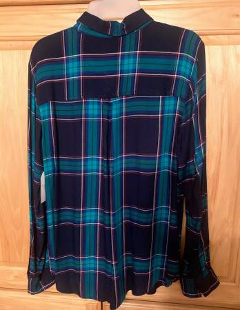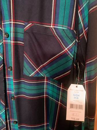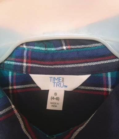 Brand new with tag attached. Time and Tru brand. Size S (4-6). Plaid aqua and black. One breast pocket. Button front. Machine washable. Rayon.