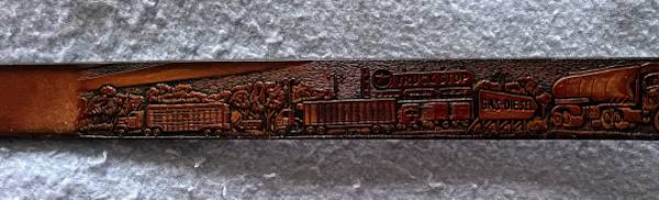 40” long. 5 holes. Leather. Put your own buckle on it. Purchased in Tennessee from the man who carved it. Never worn. Brand new. “Chuck” is on the belt, and all kinds of trucks, hand carved, beautifully done.