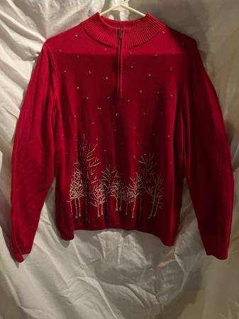 "Coldwater Creek" Sweater - Size Large (14-16) Red, beaded and sequined with embroidered tree designs Pullover with half-zip closure 55% Cotton; 45% Rayon Great condition.....perfect for Christmas,...