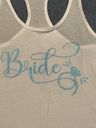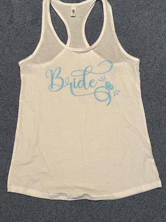 "Bride" Racerback Shirt from "Ideal" by Next Level Size Large White with Blue Sparkling Letters and Ring NEW w/o tags - never worn! Pick up today for $12! (Cash only, please)