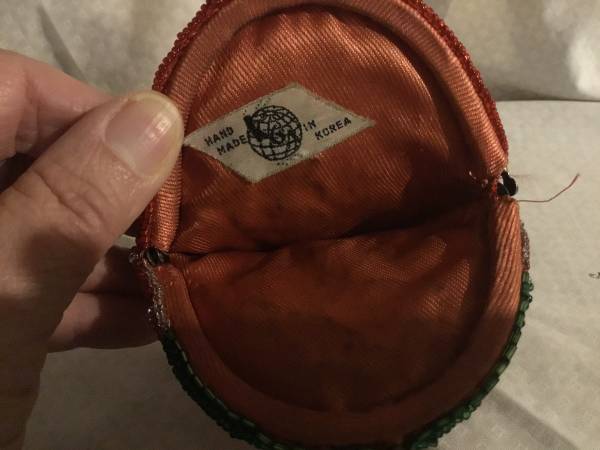 Vintage Strawberry Beaded Change Purse Front is beaded like a Strawberry; back is plain beaded red Approximately 5" X 3.5" Cloth lined Appears to be hand-made in Korea Shows minor wear, but is in...