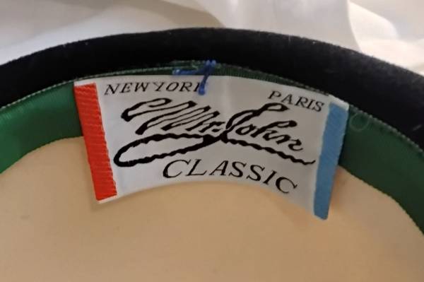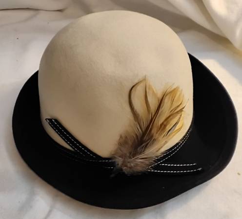 This a vintage wool hat from the Classics Excello collection by Mr. John, Geo. W. Bollman and Co. It has an off-white top, black rim, and black trim with feathers. It measures 11"×11" with 5" crown...