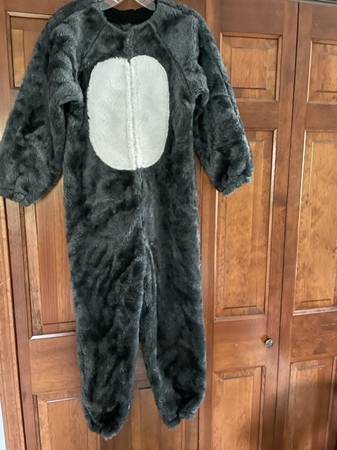 Handmade from head to toe with fun fur fabric purchased at JoAnn Fabrics. See all three photos. Costume consists of a one-piece, front-zippered body with attached stuffed long tail. Elastic bands at wrists and ankles. Body length is 50" from shoulder to bottom of elastic at ankle. Full head covering with attached ears and double snaps at front neck area. Large silky black ribbon ties to a bow in the front over neck area. Gloves for hands; shoe coverings with elastic bands at ankles and bottom of shoe area to hold in place. Nice heavier-weight costume that won't require wearing a coat if the evening is cold.